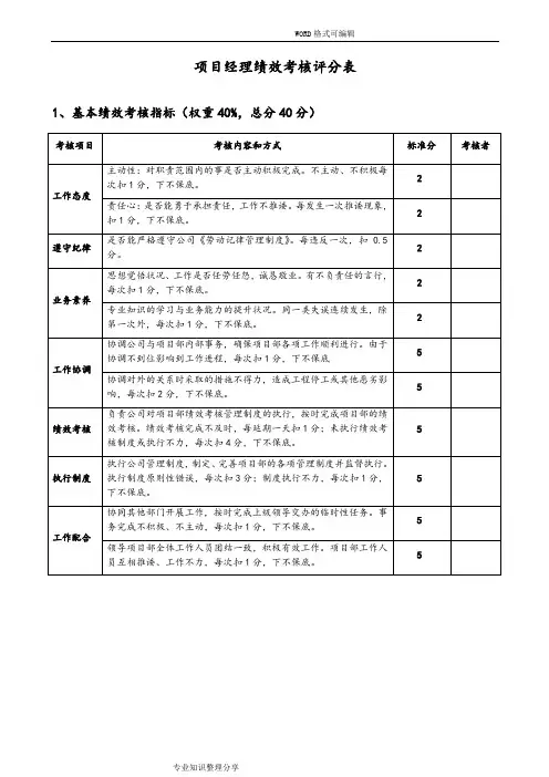 项目经理绩效考核评分表1、基本绩效考核指标(权重40%,总分40分)2、关键绩效考核指标(权重60%,总分60分)项目经理绩效考核评分表项目部:姓名:考核期:年月考核人签字:被考核人签字:技术负责人绩效考核评分表1、基本绩效考核指标(权重30%总分30分)2、关键绩效考核指标(权重70%总分70分)技术负责人绩效考核评分表项目部:姓名:考核期:年月项目经理:考核人签字:被考核人签字:项目副经理绩效考核评分表1、本绩效考核指标(权重30%总分30分)2、关键绩效考核指标(权重70%总分70分)项目副经理绩效考核评分表项目部:姓名:考核期:年月项目经理:考核人签字:被考核人签字:质量员绩效考核评分表1、基本绩效考核指标(权重30%总分30分)2、关键绩效考核指标(权重70%总分70分)质量员绩效考核评分表项目部:姓名:考核期:年月项目经理:考核人签字:被考核人签字:试验员绩效考核评分表1、基本绩效考核指标(权重30%总分30分)2、关键绩效考核指标(权重70%总分70分)试验员绩效考核评分表项目部:姓名:考核期:年月项目经理:考核人签字:被考核人签字:测量员绩效考核评分表1、基本绩效考核指标(权重30%总分30分)2、关键绩效考核指标(权重70%总分70分)项目测量员绩效考核评分表项目部:姓名:考核期:年月项目经理:考核人签字:被考核人签字:安全员绩效考核评分表1、基本绩效考核指标(权重30%总分30分)2、关键绩效考核指标(权重70%总分70分)项目安全员绩效考核评分表项目部:姓名:考核期:年月项目经理:考核人签字:被考核人签字:施工员绩效考核评分表1、基本绩效考核指标(权重30%总分30分)2、关键绩效考核指标(权重70%总分70分)施工员绩效考核表评分表项目部:姓名:考核期:年月项目经理:考核人签字:被考核人签字:材料员绩效考核评分表1、基本绩效考核指标(权重30%总分30分)2、关键绩效考核指标(权重70%总分70分)材料员绩效考核评分表项目部:姓名:考核期:年月项目经理:考核人签字:被考核人签字:1、基本绩效考核指标(权重30%总分30分)分)2、关键绩效考核指标(权重70%总分70项目部:姓名:考核期:年月项目经理:考核人签字:被考核人签字:项目部办公室文员绩效考核评分表1、基本绩效考核指标(权重30%,总分30分)2、关键绩效考核指标(权重70%,总分70分)归档资料符合标准,资料码放整齐、有序、分类合理(4-5);归档工作合格,无明显错误(1-4);归档混乱,漏洞百出(0-1);归档及时准确,详细登记后输入电脑,电子稿保存完整(4-5);存档准确但不及时,完成工作无大错(1-4);拖沓不准确,电子档杂乱无序(0-1);档案柜资料清晰完整,无遗失,易查阅,卫生符合标准(4-5);保存完整,无明显错误(1-4);档案资料遗失,杂乱,卫生较差(0-1);严格履行借阅登记手续,有详细文字记录(4-5);有借阅登记手续,文字记录不够全面(1-4)没有登记手续和文字记录或是杂乱无章(0-1)严守机密,不在任何场合谈及有关单位秘密事件事宜(0-5)因疏忽导致单位秘密事件泄露,影响单位荣誉(开除)项目部办公室文员绩效考核评分表项目部:姓名:考核期:年月考核人签字:被考核人签字:。