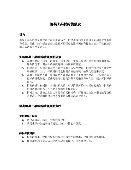 二、梁板拆模强度的影响因素1.混凝土强度:混凝土的强度是梁板拆模强度的基础。