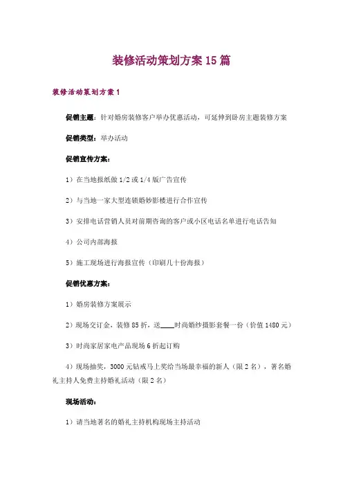 装修活动策划方案15篇装修活动策划方案1促销主题:针对婚房装修客户举办优惠活动,可延伸到卧房主题装修方案促销类型:举办活动促销宣传方案:1)在当地报纸做1/2或1/4版广告宣传2)与当地一家大型连锁婚妙影楼进行合作宣传3)安排电话营销人员对前期咨询的客户或小区电话名单进行电话告知4)公司内部海报5)施工现场进行海报宣传(印刷几十份海报)促销优惠方案:1)婚房装修方案展示2)现场交订金,装修85折,送____时尚婚纱摄影套餐一份(价值1480元)3)时尚家居家电产品现场6折起订购4)现场抽奖,3000元钻戒马上奖给当场最幸福的新人(限2名),著名婚礼主持人免费主持婚礼活动(限2名)现场活动:1)请当地著名的婚礼主持机构现场主持活动2)现场举办新人配合类游戏得小家电礼品3)“美丽瞬间”爱情誓言活动(由新人在特殊背景布前进行爱情宣誓,并由摄影机构拍摄成相片,装裱成巨幅相框后送给新人)促销准备:1)与____婚妙摄影机构和婚礼策划机构合作2)婚房与卧房设计方案展示3)家居家电厂商合作方案评估:本方案专门针对于婚房,这对于培育公司优势是很好的宣传。