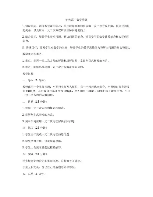 沪教高中数学教案1. 知识目标:通过本节课的学习,学生能够掌握如何求解一元二次方程的解、判别式和根的关系,以及应用一元二次方程解决实际问题的能力。