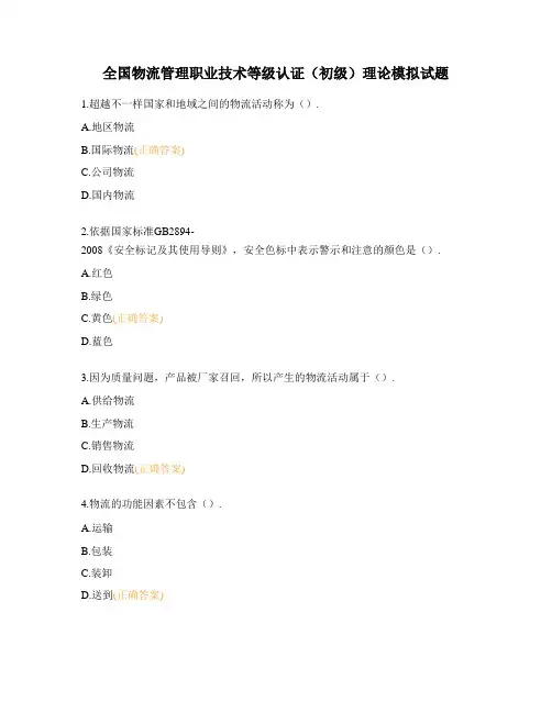 全国物流管理职业技能等级认证(初级)理论模拟试卷(二)您的姓名: [填空题] *_________________________________一、单项选择题(本大题共40小题,每小题1分,共40分)1.根据国家标准GB2894-2008《安全标志及其使用导则》,安全色标中提示安全状态和通行的颜色是()。
