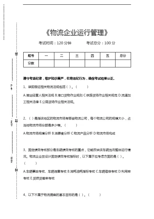 《物流企业运行管理》考试时间:120分钟 考试总分:100分遵守考场纪律,维护知识尊严,杜绝违纪行为,确保考试结果公正。