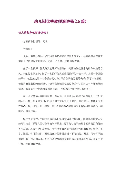 幼儿园优秀教师演讲稿(15篇)幼儿园优秀教师演讲稿1尊敬的各位领导、同事:大家好!作为一名幼儿教师,只有科学地把握好教书育人的关系,并且将其合理地贯彻到自己的实际工作中去,才是一个合格、称职的好教师。