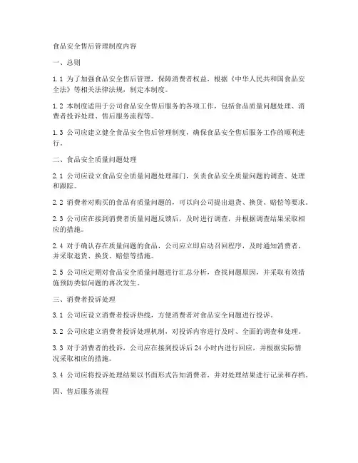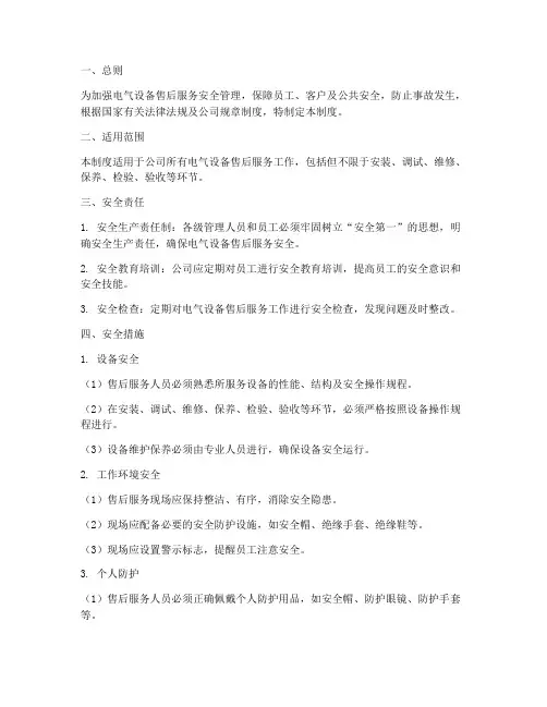 四、安全管理制度1. 售后服务人员上岗前,必须经过专业培训,掌握必要的安全知识和技能。