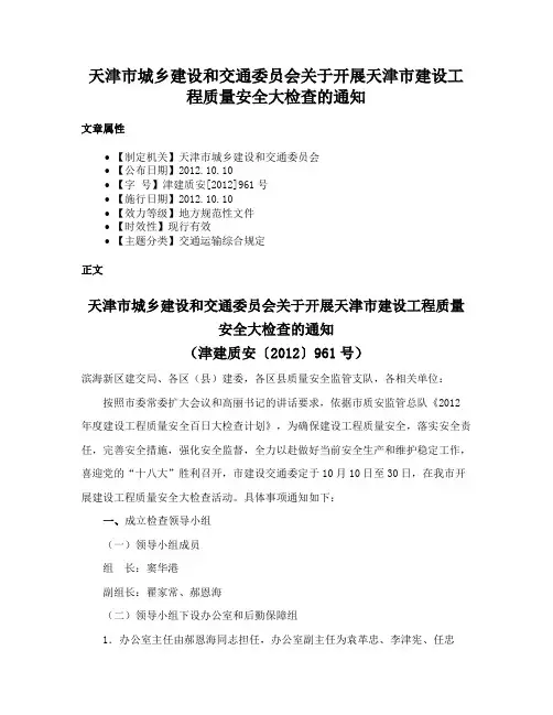 天津市城乡建设和交通委员会关于开展天津市建设工程质量安全大检查的通知文章属性•【制定机关】天津市城乡建设和交通委员会•【公布日期】2012.10.10•【字号】津建质安[2012]961号•【施行日期】2012.10.10•【效力等级】地方规范性文件•【时效性】现行有效•【主题分类】交通运输综合规定正文天津市城乡建设和交通委员会关于开展天津市建设工程质量安全大检查的通知(津建质安〔2012〕961号)滨海新区建交局、各区(县)建委,各区县质量安全监管支队,各相关单位:按照市委常委扩大会议和高丽书记的讲话要求,依据市质安监管总队《2012年度建设工程质量安全百日大检查计划》,为确保建设工程质量安全,落实安全责任,完善安全措施,强化安全监督,全力以赴做好当前安全生产和维护稳定工作,喜迎党的“十八大”胜利召开,市建设交通委定于10月10日至30日,在我市开展建设工程质量安全大检查活动。