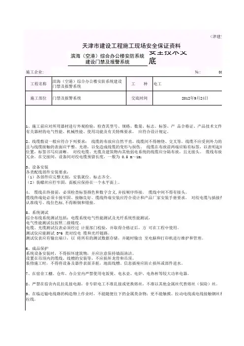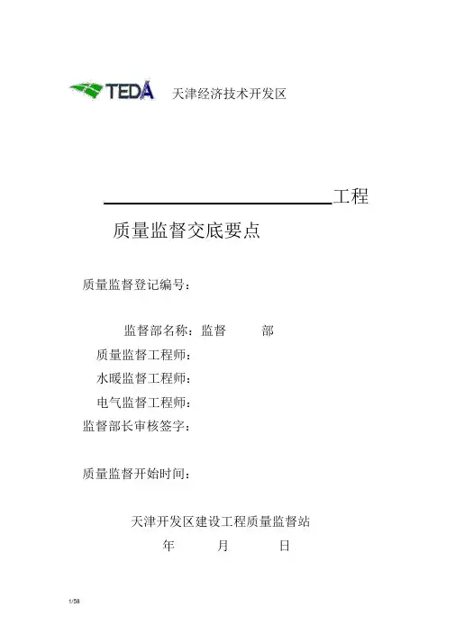 天津经济技术开发区工程质量监督交底要点质量监督登记编号:监督部名称:监督部质量监督工程师:水暖监督工程师:电气监督工程师:监督部长审核签字:质量监督开始时间:天津开发区建设工程质量监督站年月日建设工程质量监督交底清单序号交底项目名称1监督工作的依据、方法和内容2执行《建设工程质量管理手册》3对责任主体和有关机构质量行为的要求4违法违规行为的行政处罚5对建设单位的几点提示6深度大于 4 米的基坑、基槽工程7桩基工程8钢筋混凝土工程9填充墙砌体工程10钢结构工程11住宅工程12建筑装饰装修工程13居住建筑节能工程14幕墙工程15屋面工程16给排水及采暖工程17通风空调工程18电气安装工程19水、电分部(公建、住宅工程)的补充要点建设单位监理单位被交总承包单位底人桩基承包单位签字是否交底备注√√√√√交底人签字交底时间监督工作的依据、方法和内容依据国务院《建设工程质量管理条例》和相关法律、法规、强制性技术规范标准,以及施工图设计文件所涉及的法律、法规和天津市、开发区的有关规定,核查受监工程的建设、勘察、设计、监理、施工、检测、构配件及商品砼生产单位的资质,检查人员资格以及参建各方质量行为及执行强制性标准的情况,抽查工程质量。