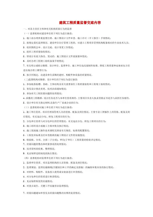 建筑工程质量监督交底内容一、对各方责任主体和有关机构质量行为的监督(一)监督机构对建设单位的下列行为进行抽查:1、施工前办理质量监督注册、施工图设计文件审查、施工许可(开工报告)手续情况;2、按规定委托监理情况,建设单位自行管理工程的,应建立工程项目管理机构配备相应的专业技术人员;3、组织图纸会审、设计交底、设计变更工作情况;4、组织工程质量验收情况;5、原设计有重大修改、变动的,施工图设计文件重新报审情况;6、及时办理工程竣工验收备案手续情况;7、有无明示或暗示勘察、设计单位、监理单位、施工单位违反强制性标准,降低工程质量和迫使承包方任意压缩合理工期等行为;8、按合同规定,由建设单位采购的建材、构配件和设备的质量情况。