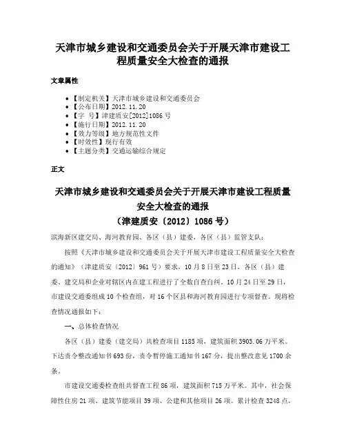天津市城乡建设和交通委员会关于开展天津市建设工程质量安全大检查的通报文章属性•【制定机关】天津市城乡建设和交通委员会•【公布日期】2012.11.20•【字号】津建质安[2012]1086号•【施行日期】2012.11.20•【效力等级】地方规范性文件•【时效性】现行有效•【主题分类】交通运输综合规定正文天津市城乡建设和交通委员会关于开展天津市建设工程质量安全大检查的通报(津建质安〔2012〕1086号)滨海新区建交局、海河教育园、各区(县)建委,各区(县)监管支队:按照《天津市城乡建设和交通委员会关于开展天津市建设工程质量安全大检查的通知》(津建质安〔2012〕961号)要求,10月8日至23日,各区(县)建委、建交局和企业对辖区内在建工程进行了全数自查自纠。