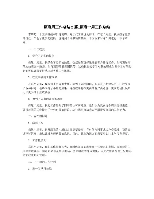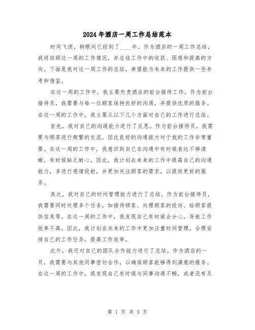酒店前台周工作总结5篇第1篇示例:酒店前台是整个酒店的形象窗口,也是服务质量的重要保障。