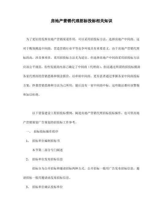 房地产营销代理招标投标程序1. 背景介绍在房地产行业中,为了促进房地产项目销售和市场拓展,房地产开发商常常选择招标投标的方式来寻找营销代理。