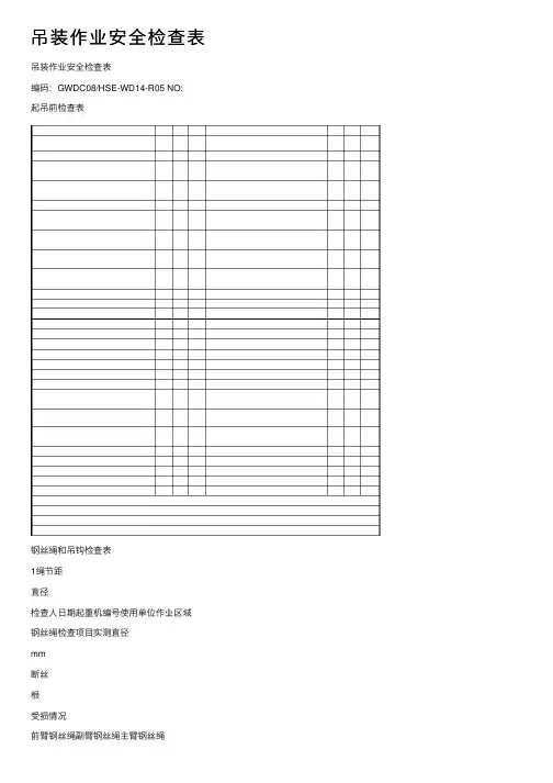 吊装作业安全检查表吊装作业安全检查表编码:GWDC08/HSE-WD14-R05 NO:起吊前检查表钢丝绳和吊钩检查表1绳节距直径检查⼈⽇期起重机编号使⽤单位作业区域钢丝绳检查项⽬实测直径mm断丝根受损情况前臂钢丝绳副臂钢丝绳主臂钢丝绳吊钩检查项⽬实测开⼝尺⼨mm直径mm是否有安全销是否变形主钩辅钩说明:如果出现下列任意⼀种情况,应更换钢丝绳或吊钩:a) ⼀个绳节距上有六个断丝或⼀个绳节距内⼀个绳股上有三个断丝;b) 钢丝绳外径磨损量达到三分之⼀;c) 扭结、压扁、鸟笼或其它结构性损坏;d) 有热损坏的迹象:1) 直径19mm以下(含)的钢丝绳,直径减少超过1.2mm;2) 直径22mm~30mm(含)的钢丝绳直径减少超过1.5mm;3) 直径32mm~38mm(含)以上的钢丝绳直径减少超过2.4mm。