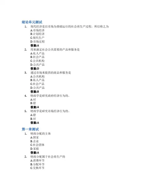 绪论单元测试1.现代经济是以市场为基础运行的社会再生产过程,所以称之为A:市场经济B:计划经济C:现代生产D:市场过程答案:A2.用来满足社会公共需要的产品和服务是A:私人产品B:社会产品C:公共机构D:公共产品答案:D3.通过市场来提供的商品和服务是A:公共机构B:私人产品C:社会产品D:公共产品答案:B4.财政学是研究政府经济行为的。