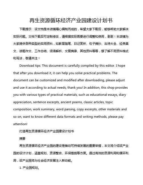 文档下载后可定制修改,请根据实际需要进行调整和使用,谢谢!本店铺为大家提供各种类型的实用资料,如教育随笔、日记赏析、句子摘抄、古诗大全、经典美文、话题作文、工作总结、词语解析、文案摘录、其他资料等等,想了解不同资料格式和写法,敬请关注!Download tips: This document is carefully compiled by this editor. I hope that after you download it, it can help you solve practical problems. The document can be customized and modified after downloading, please adjust and use it according to actual needs, thank you! In addition, this shop provides you with various types of practical materials, such as educational essays, diary appreciation, sentence excerpts, ancient poems, classic articles, topic composition, work summary, word parsing, copy excerpts, other materials and so on, want to know different data formats and writing methods, please pay attention!打造再生资源循环经济产业园建设计划书摘要再生资源循环经济产业园的建设是推动可持续发展的重要举措,本文将介绍该产业园的设计计划,涵盖规划、资源整合、环保措施等方面。