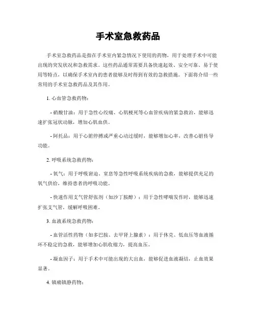 二、常用的手术室急救药品及其作用1. 心血管急救药品:如硝酸甘油、阿托品、肾上腺素等。