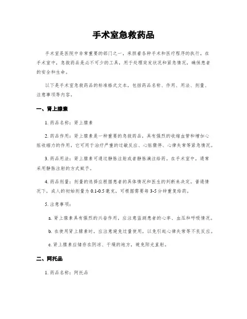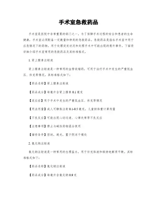 以下是手术室急救药品的标准格式文本:一、急救药品的定义和作用急救药品是指在手术室内用于急救和紧急情况下的药物。
