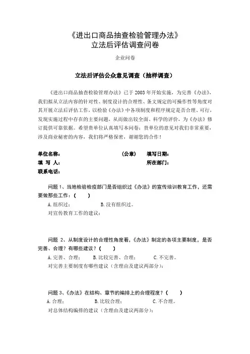 《进出口商品抽查检验管理办法》立法后评估调查问卷企业问卷立法后评估公众意见调查(抽样调查)《进出口商品抽查检验管理办法》已于2003年开始实施,为完善《办法》,我们拟从立法内容的针对性、制度设计的合理性、条文规定的可操作性等角度对其开展立法后评估工作,以检验《办法》中各项制度和程序规定是否合理、可行,发现实施过程中存在的主要问题,从而做出较全面、科学的评价,为《办法》修订提供可靠依据。