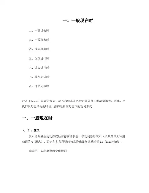 一、时态变化规则时态指的是动词所表示的动作或状态发生的时间。