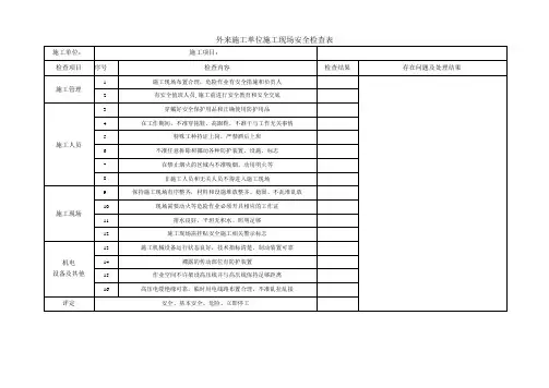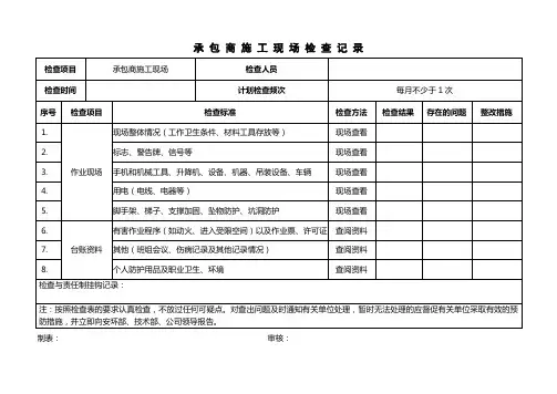 承包商施工现场检查表承包商名称:现场检查地址: 日期:检查员: 承包商陪检代表:是= 与检查内容符合否= 与检查内容不符合无= 与本次检查无关编号检查内容 是 否 无 检查结果1 安全帽,按要求配戴坚硬的安全帽并加以维护a. 现场不戴安全帽b. 配戴破裂和不合格的安全帽c. 不系帽带2安全鞋,依工作要求穿上适当的防护鞋a. 现场内不穿安全鞋3 根据需要配戴听力保护用具4正确配戴所要求的防护镜,在打磨,动火等特殊操作中,配戴专用面罩和护目镜.5 当需要时配戴手套等手部防护用品6工作牌a. 无工作牌7 在工地赤裸上身、穿背心、短袖8 在现场喝酒或带酒类入场、酒后入场9 未经许可擅入生产车间等10 在现场打架11 a. 偷盗建筑材料、工具等(不办理出门证强行出门将被视为偷盗行为)b. 未经许可挪用别的承包商的建筑材料、工具等12 在现场嬉戏、追逐、打闹13 高处作业(2米以上) --- 无合格脚手架、平台等,配备所需的人体安全带并正确穿戴a. 不背安全带b. 不扣安全带c. 使用不合格的、有瑕疵的安全带d. 不正确使用梯子或使用不合格的梯子f. 使用未经验收许可的脚手架、移动平台(未挂牌)e. 高处、临边未按要求拉救生绳f. 使用不合格的升降平台 (未经检查)g. 作业时安全带系挂牢靠并有符合要求的系挂点h. 工作平台防坠护栏完整i. 安装的防坠绳索可以承受5400磅的冲击力(2451公斤) j. 防坠设备仅用于防坠k. 地面孔洞,护栏扶手至少可以承受200磅的力14 高空坠物a. 临边、开口(洞口)作业未作防护b. 从高处(超过两米)向下抛物c. 私自撤除临边、开口围护栏杆或经许可但不及时恢复者15 受限空间a. 进行风险评估并签名b. 工作人员知道许可条件c. 工作人员接受简要介绍并知道紧急措施d. 照明和电气设备合格并已检查16 工作许可证a. 未办理工作许可证擅自从事开挖、探伤、封闭区间作业、吊装作业等要求许可证的工作b. 作业前安全交底并每日重温c. 严格按规程操作,如危险评估、受限空间通道、电气等d. 强制锁定和隔离装置就位,当需要时使用e. 工作人员知道许可证限制范围和紧急情况下应急措施17 施工用电a. 未经许可而擅自接电b. 用电、配电设备未经验收而擅自使用c. 电线、电缆使用时未高挂而阻止通道d. 电缆线 - 状况良好并时常检查e. 电缆、软管和焊接线等已架高,无断开危险18 电焊、气割a. 使用性能不良或破烂焊接、气割设备b. 不戴面罩、防护手套者c. 乙炔和氧气瓶的摆放距离不足5米或气瓶未直立捆绑固定d. 不配备灭火器或不做防火措施e. 乙炔气瓶无止回阀19 蓄意破坏现场机械、设施、设备等20 动土作业a. 安全通道(搭设的坡道和梯子应能超出地面1米)b. 适当的放坡和支护c. 每间隔10米设有安全的人员上下通道d. 每日安全检查并有书面记录e. 完整护栏和醒目的标志f. 工作人员应了解和熟悉紧急措施21 脚手架和梯子a. 按规范搭设(水平和直角的)b. 具备适当的人员上下通道c. 标注正确的标签(标签应清楚,干净和耐用)d. 使用工作用合适的梯子并绑扎牢靠,e. 跳板放于适当位置并扎紧和搭接f. 扶手和中间栏杆放于合适的位置22 防火工作和危险材料的储存a. 标牌和围栏表示指明的储存区b. 容器标有储存物品标签c. 灭火器配备适当并定位d. 回火阀已安装,软管合格e. 压缩气瓶维护,使用和存放正确f. 动火作业有适当封闭隔离等减少火花等危险的措施,焊接使用防护罩.g. 调节器正确安装和维护h. 材料安全数据表(MSDS)已注册,当使用时出示23 文明施工a. 未作到当日工完场清b. 工作现场整齐整洁无多余垃圾和碎片,现场垃圾存放点垃圾不按要求及时清运c. 对别人的成品蓄意污染者(不作保护)d. 蓄意破坏现场围挡、标语、警告牌等 (未经安全部门许可)e. 在现场吸烟(非吸烟点)f. 材料设备放置得当,材料乱堆、乱放或堆放不整齐g. 各施工通道及人员走道整洁无障碍物h. 现场废金属材料无凸出的铁钉或其它可能刺伤人员的尖锐物i. 现场配备有垃圾收集容器和储水桶j. 危险区域已安装护拦和/或钢筋条保护帽并有良好维护24 夜晚加班不设照明或照明不足25 从事特殊工种而无特殊工种操作证26 因为不安全的工作方法给别人造成了伤害27 未经安全培训上岗者28管理a. 管理人员不顾工人安危盲目指挥或置工人于极度危险之中b. 施工管理人员对现场合理化安全建议不支持c. 相关管理人员未能准时参加联合大检查、安全会议29 吊装a. 未按批准的施工安全方案或大型(双机)吊装无方案、许可证b. 不作现场隔离防护c. 吊物、吊臂上下站人d. 吊装机械未经现场机械工程师或安全人员检查而私自入场作业e. 未正确拴挂吊物或吊物过多、过高f. 链条、索具、卸扣等处于良好状态并于使用前检查g. 设备和起重机合格证是否正确和注册h. 起重设备的技术和方法是否正确(测位仪和束带滑车等,通讯设备等)30 使用不文明语言谩骂、辱骂别人31 施工现场睡觉或守夜值班当班睡觉32 来访a. 对进入现场的来访者不按规定戴PPEb. 入场车辆超速行驶(大于15公里/小时)33 其它a. 照明, 通风和温度等b. 紧急救护和灭火器符合要求c. 自上月检查还未整改的条目数。