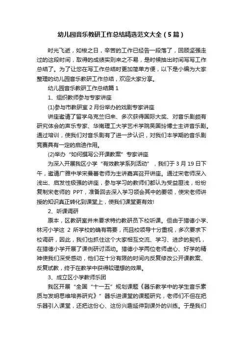 幼儿园音乐教研总结5篇篇1一、背景介绍本学期,我园音乐教研工作以全面提高幼儿音乐素质和教师专业素养为目标,通过多种形式的学习、研讨、观摩和交流,努力提升我园音乐教育的质量和水平。