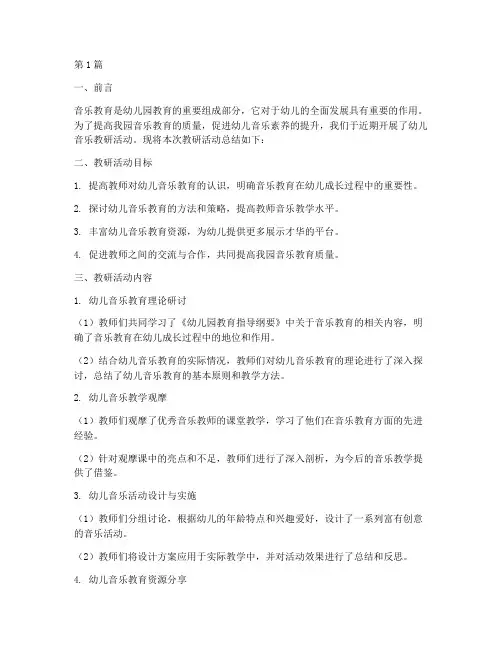 第1篇一、前言音乐是幼儿表达情感、认知世界的重要途径,也是幼儿园教育的重要组成部分。