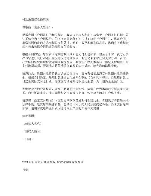 特此提醒!(债权人名称)(债权人签名)(日期)2024带目录带附件详细版-付款逾期催收提醒函目录:1. 引言2. 合同背景3. 逾期付款情况4. 催收提醒5. 法律责任6. 解决方案7. 附件1. 引言本函旨在提醒您关于逾期付款的事项,并督促您尽快履行付款义务。