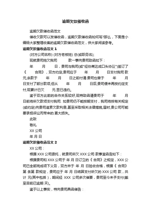 逾期欠款催收函范文1(对方公司名称) (对方老板姓) 总(或职务名);现就贵司拖欠我司款一事向贵司致函如下:年月日,贵司与我司(或"经协商达成口头协议")签订了《合同》,双方约定,贵司应于年月日支付我司款元,余款于年月日之前付清.贵司也曾于年月日支付了部分款项,但从年月日后,贵司便未再按约定支付,现累计已欠元.显已违约。