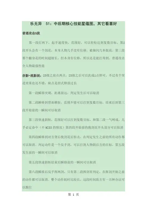 乐无异 51:中后期核心技能星蕴图,其它看喜好普通攻击3段第一段打两下,起手速度快,范围好,可以轻松达到复数目标,第2段开头会有一个剑花,本身人物几乎没有位移,被躲闪几率挺高,第三段那个翻身花的时间超级长,但本身有位移,所以还是能打得到。