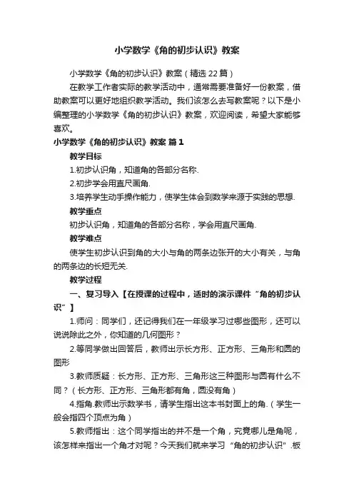 小学数学《角的初步认识》教案小学数学《角的初步认识》教案(精选22篇)在教学工作者实际的教学活动中,通常需要准备好一份教案,借助教案可以更好地组织教学活动。