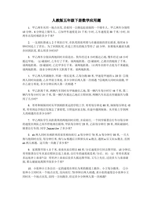 人教版五年级下册数学应用题1. 甲乙两车从同一地点出发,沿着同一公路追赶前面的一个骑车人。