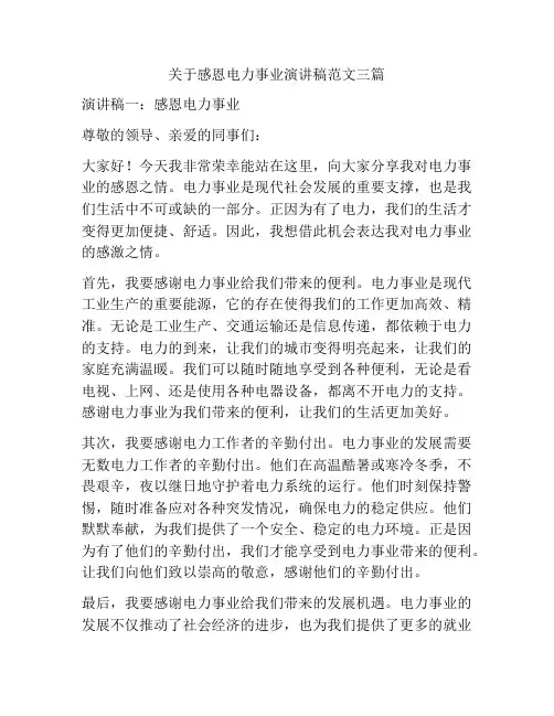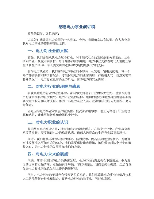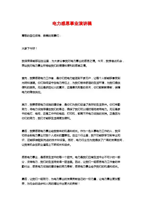 让我们心存感激,珍惜电力资源,共同努力,为电力事业的发展做出更大的贡献!谢谢大家!演讲稿二:感恩电力事业,共建美好未来尊敬的领导、亲爱的同事们:大家好!今天我非常荣幸能在这里与大家一起探讨电力事业,并表达我对电力事业的感恩之情。