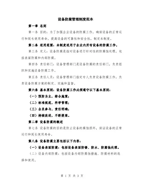 设备防腐管理制度范本一、目的和范围为了保护和延长设备的使用寿命,确保设备的正常运转和安全性能,制定本设备防腐管理制度。