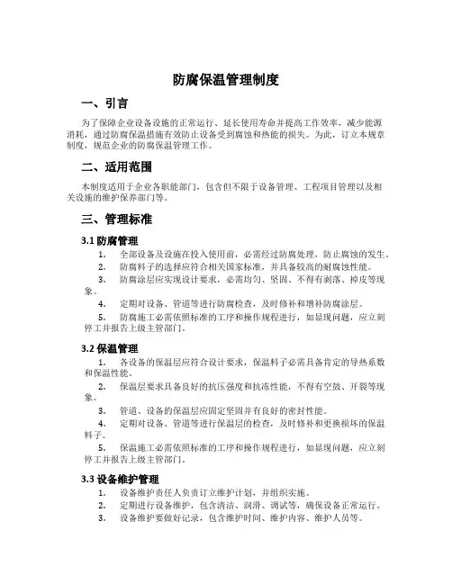 二、目的本制度的目的是为了规范和管理防腐保温工作,促进企业设备的安全运行,提高企业设备的效率,降低设备的维护成本,确保生产环境的安全,并防止事故的发生。