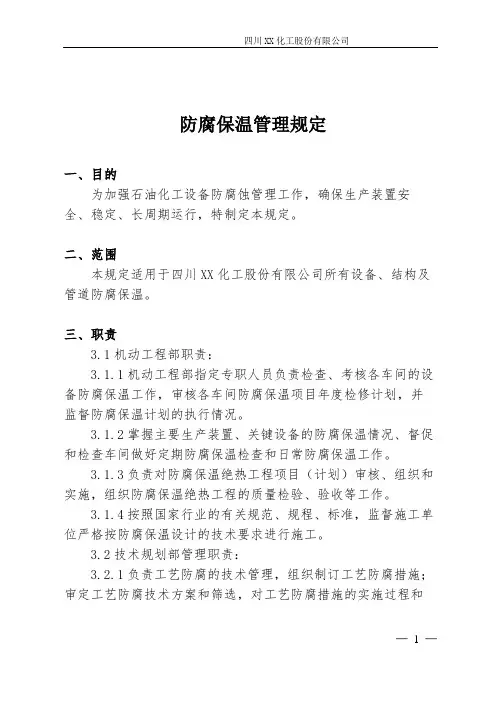 防腐保温管理规定一、目的为加强石油化工设备防腐蚀管理工作,确保生产装置安全、稳定、长周期运行,特制定本规定。