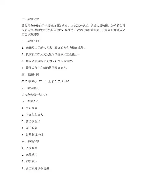 三、演练时间2023年10月27日,上午9:00-11:00四、演练地点公司办公楼一层大厅五、参演人员1. 公司领导2. 各部门负责人3. 消防安全员4. 员工代表5. 演练指挥小组六、演练内容1. 火灾报警2. 疏散逃生3. 初步灭火4. 消防设施设备使用5. 现场救护6. 演练总结七、演练流程(一)火灾报警1. 模拟场景:公司办公楼一层大厅电线短路引发火灾,火势迅速蔓延。