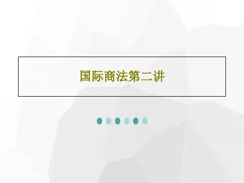 “International”·政治意义—国家与国家之间(F)not between nations·地理意义—跨越国界(T)transnational国际商法的内容1·有关调整国际货物生意方面的法律标准,如:合同法、商事组织法、生意法、代理法、产品责任法等;有关国际商事交易方面的法律标准,如:合同法、国际技术贸易法、工业产权法、国际投资法、国际融资法、国际工程承包和国际租赁法等有关处置国际商事争议方面的法律标准,如:国际商事仲裁法、国际投资仲裁法和各国商事诉讼法等。