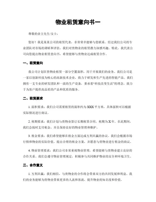 物业租赁意向书(一)5篇第1篇示例:尊敬的物业管理公司:我是一家新成立的企业,现计划在贵物业中心租赁一处办公场所,以开展我们的业务。