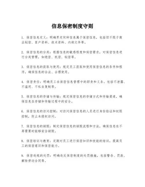 信息保密制度守则1. 保密信息定义:明确界定何种信息属于保密信息,包括但不限于商业秘密、客户资料、技术资料、内部文件等。