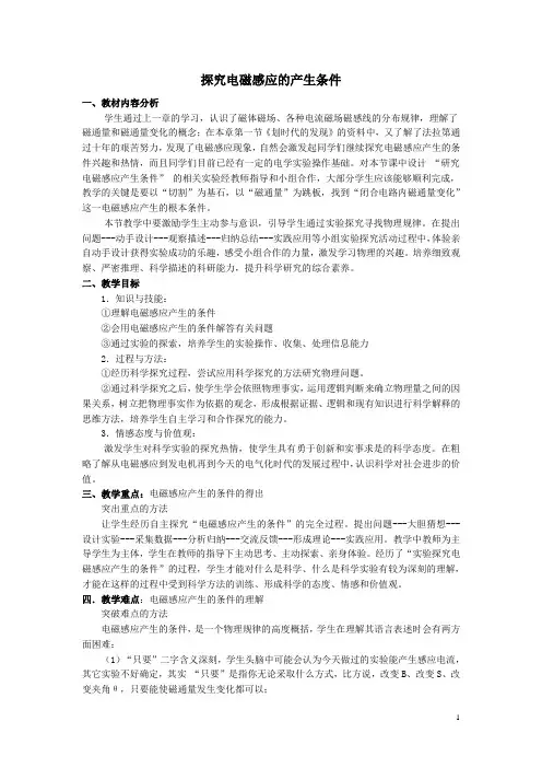探究电磁感应的产生条件一、教材内容分析学生通过上一章的学习,认识了磁体磁场、各种电流磁场磁感线的分布规律,理解了磁通量和磁通量变化的概念;在本章第一节《划时代的发现》的资料中,又了解了法拉第通过十年的艰苦努力,发现了电磁感应现象,自然会激发起同学们继续探究电磁感应产生的条件兴趣和热情,而且同学们目前已经有一定的电学实验操作基础。