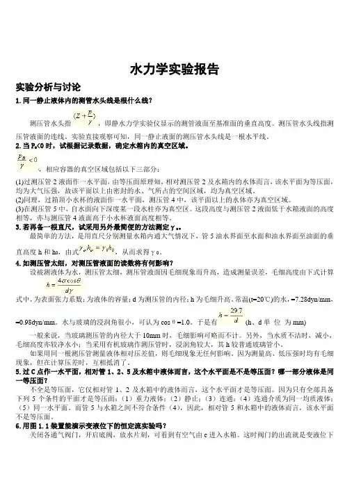水力学实验报告实验分析与讨论1.同一静止液体内的测管水头线是根什么线?测压管水头指,即静水力学实验仪显示的测管液面至基准面的垂直高度。