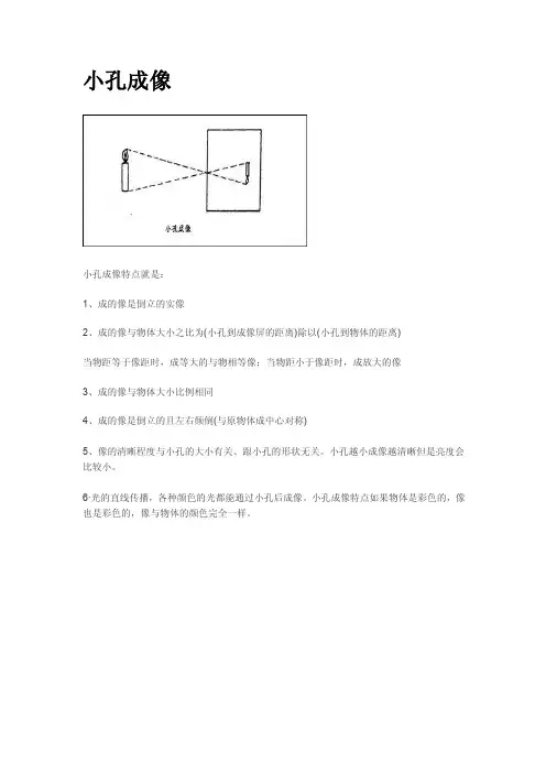 二、小孔成像的特点1. 倒立:小孔成像的图像是倒立的,这是由于光线的传播规律决定的。