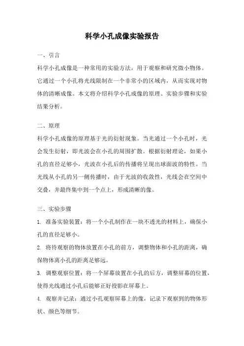 小孔成像实验报告小孔成像实验报告一、实验目的:通过小孔成像实验,观察小孔成像的现象,了解小孔成像的原理。