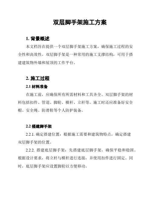 双层脚手架施工方案1. 背景概述本文档旨在提供一个双层脚手架施工方案,确保施工过程的安全性和高效性。