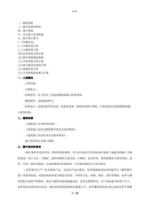 一、工程概况 (1)二、编制依据 (1)三、脚手架材料要求 (1)四、施工措施 (2)1.地基处理 (2)2.排水措施 (2)3.外脚手架搭设的构造要求 (2)4.框架梁板脚手架的构造要求 (5)五、脚手架搭设施工工艺 (6)六、安全施工技术措施 (6)七、脚手架计算书 (7)(一)参数信息: (8)(二)大横杆的计算: (9)(三)小横杆的计算: (11)(四)扣件抗滑力的计算: (12)(五)脚手架荷载标准值: (12)(六)立杆的稳定性计算: (13) (14)(七)最大搭设高度的计算: (14)(八)连墙件的计算: (15)(九)立杆的地基承载力计算: (16)一、工程概况1.工程名称:2.工程地点:3.结构类型:本工程为二层现浇钢筋混凝土框架结构。
