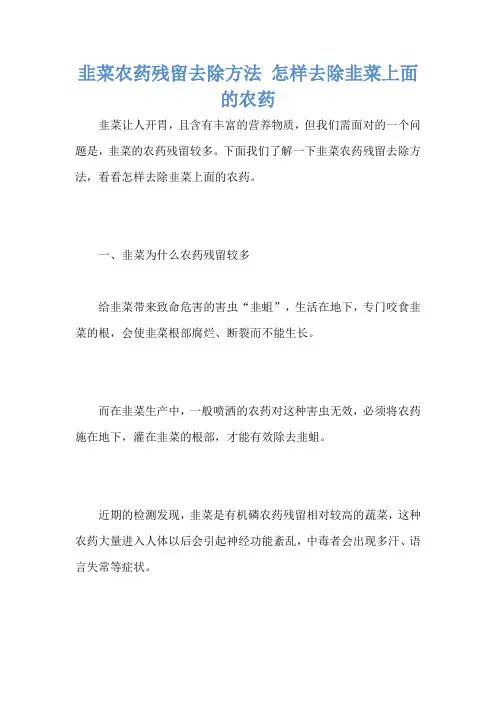 一、韭菜农药残留的原因1.不规范的农业方法在韭菜的种植和生产过程中,许多农民会因为节省成本或者增加产量而滥用农药,而这些农药不正确的使用方法或者不遵守安全期,在韭菜上产生了很大的污染,从而导致了韭菜中农药残留的问题。