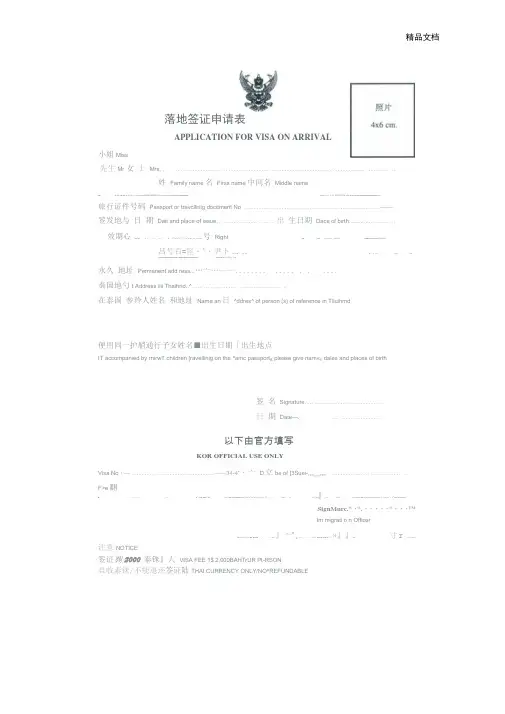 小姐Miss 落地签证申请表APPLICATION FOR VISA ON ARRIVAL先生Mr 女士Mrs, ... .. ......................... .. ........................ .................................... . ................. .............. ..姓Family name 名Firss name 中间名Middle name[M N At llQ'na ll t i.M.i.i.u.i-M-id4M B B B BBBBBiikiuaajaaiiaaaan■■■■■■■■■■■■■■.i.■.i.■.1.1.1.i.KEUU-if.iu.uBi.■.■.■■.■■■■■■■■■■■■■■■■ ar■旅行证件号码Passport or travclliriig docitmerit No ................................................................................. ——-签发地与日期Dait and place of issue, .. .... ............... ...... .. 出生日期Dace of birth.... ..... .... .......... ..效期心aX l Ci・・n・・""!>・・i!・・・ii"・r s ra*n^P"”・hi>n*m~riF"rmrW号Right ■■・・・・・・■■・・ BB uiiin・iiiiirni・■■■■■■■■■■srfrbrmr吕号百=宦・^・尹卜 1 F-■ a [・ a : a ・・i B・a・a・・・・・・・u ■・・・・・dui■■■■■■■■■■■■■■■■■■■■■■■■■■■■■■■^■■■■■fefer+4't+r i-m ‘永久地址Permanent add ress...…亠…——........ ..... . . . ....秦国地勺t Address iiii Thaihrid..^ ...... ... ............... . ......................... ..在泰国参羚人姓名和地址Name an日^ddres^ of person (s) of reference in Tliuihmd便用同一护艄通行子女姓名■出生日期「出生地点IT accompanied by rnirwT children [ravellinig on the ^amc passport B please give narn«F dales and places of birth签名Signature..... ............. ..... .. ................ .日期Date—. . ... ...................... .以下由官方填写KOR OFFICIAL USE ONLYVisa No・— ............... .................................. ——34-4“・亠D立be of ]3Suei-,……__……… ................... .. ................... ..F>e翻■- — - —- —--r - ■"-•■■•■■■" ■^ss» ■■■«■■■■■■■»•! re rr er er rr rm ir r rF・"・・・・K an r ・IIII・・・・・・・・・・BIUJ a』MM・U・・iiiiJi・・・・・u iaaanaaB J jaauuBBatiBtLi a. t.hhbi.1. j^jjddaiaa&biUSignMurc.“・“.・・・・・“・・・™Im migrati o n OfficertC«m B i-n-i ■■ ■■■■ ・・・・・1301』亠^1:111・・11・1111 ■■■■ ■>■!■> —»』』aa J J寸r WSFU FA T注意NOTICE签证麴2000泰铢』人VISA FEE 1$ 2,000BAHTrUR Pt-RSON貝收泰铢/不能退还签证陆THAI CURRENCY ONLY/NO^REFUNDABLE精品文档泰国高清版落地签申请表,注意收藏,便于您更好的出行,夏日旅温馨提醒,感谢有你。