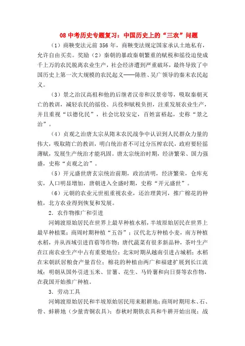 2019中考历史知识点:中国历史上的三农问题2019中考历史知识点:中国历史上的三农问题一、中国古代三农问题:1.统治政策的调整:(1)商鞅变法:公元前356年,商鞅变法规定:国家承认土地私有,允许自由买卖。