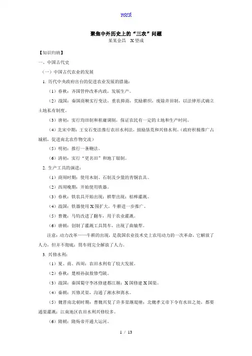 聚焦中外历史上的“三农”问题某某金昌X望成【知识归纳】一、中国古代史(一)中国古代农业的发展1. 历代中央政府出台的促进农业发展的措施:(1)春秋:齐国管仲改革内政,发展生产。