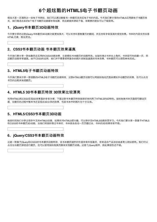 6个超炫酷的HTML5电⼦书翻页动画相信⼤家⼀定遇到过⼀些电⼦书⽹站,我们可以通过像看书⼀样翻页来浏览电⼦书的内容。