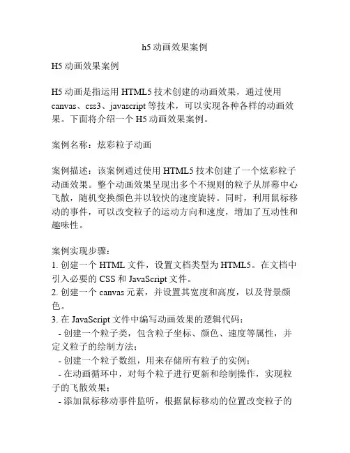 h5动画效果案例H5动画效果案例H5动画是指运用HTML5技术创建的动画效果,通过使用canvas、css3、javascript等技术,可以实现各种各样的动画效果。
