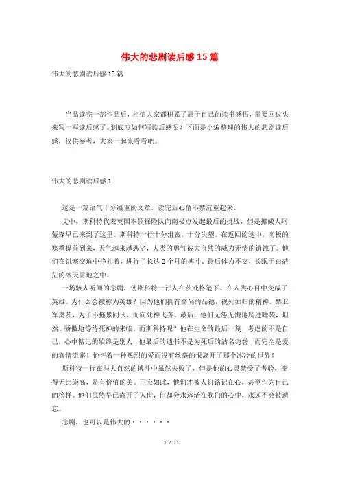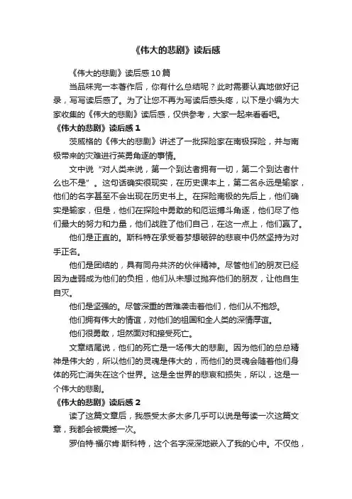 《伟大的悲剧》读后感(15篇)《伟大的悲剧》读后感1伟大的悲剧,是天空下得飘絮,在南极的天空中飘摇,冻结在凛冽的风里。